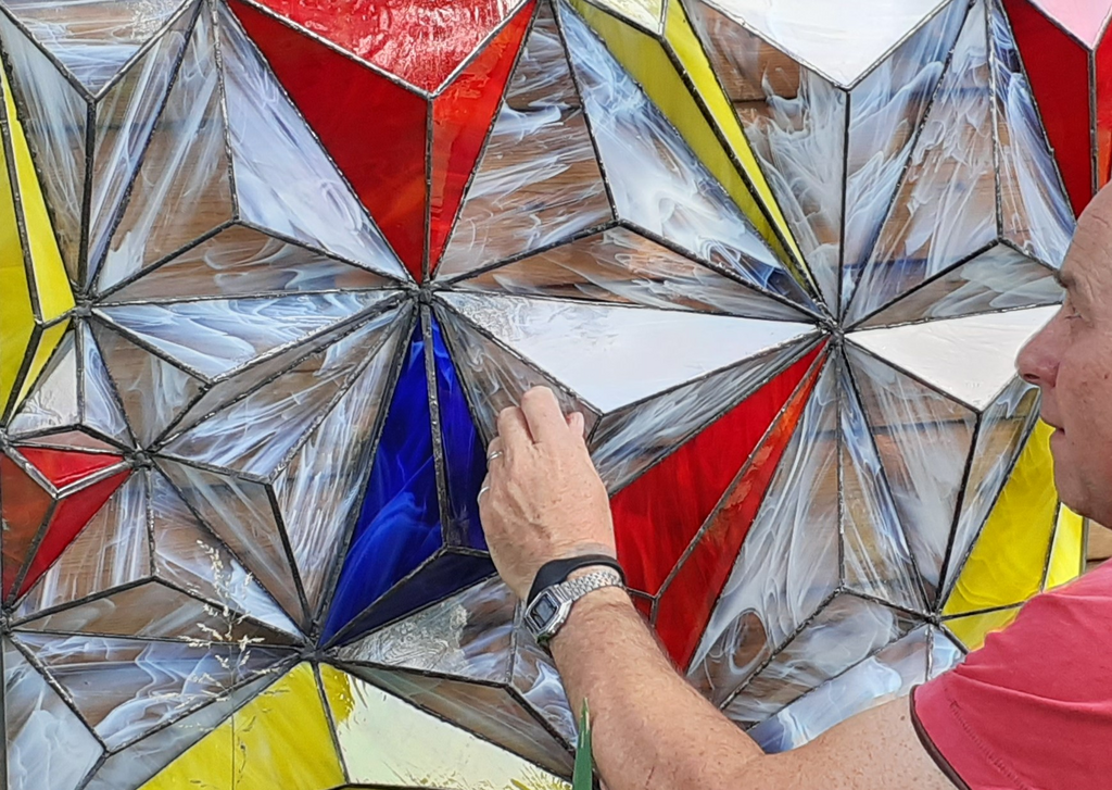 Glaswerk van Ed, diverse vormen en onderwerpen. Praktische expressie van onderwerpen in glas.