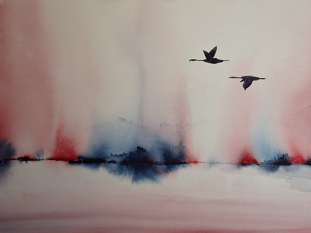 Nancy Michiels maakt momenteel vooral dromerige en fantasievolle landschappen in aquarel. Dit medium is perfect voor de losse en experimentele stijl dat kenmerkend is voor haar werk