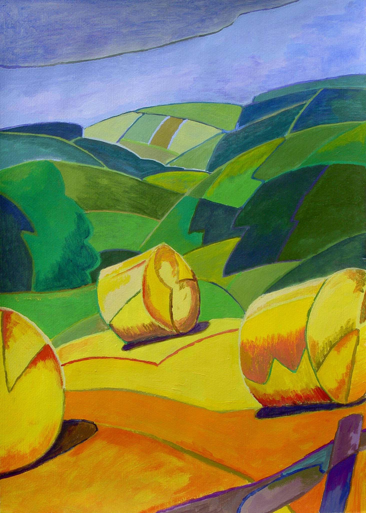 Hooiland met rollen hooi. Opgelijmd op zuurvrij karton, ingelijst.