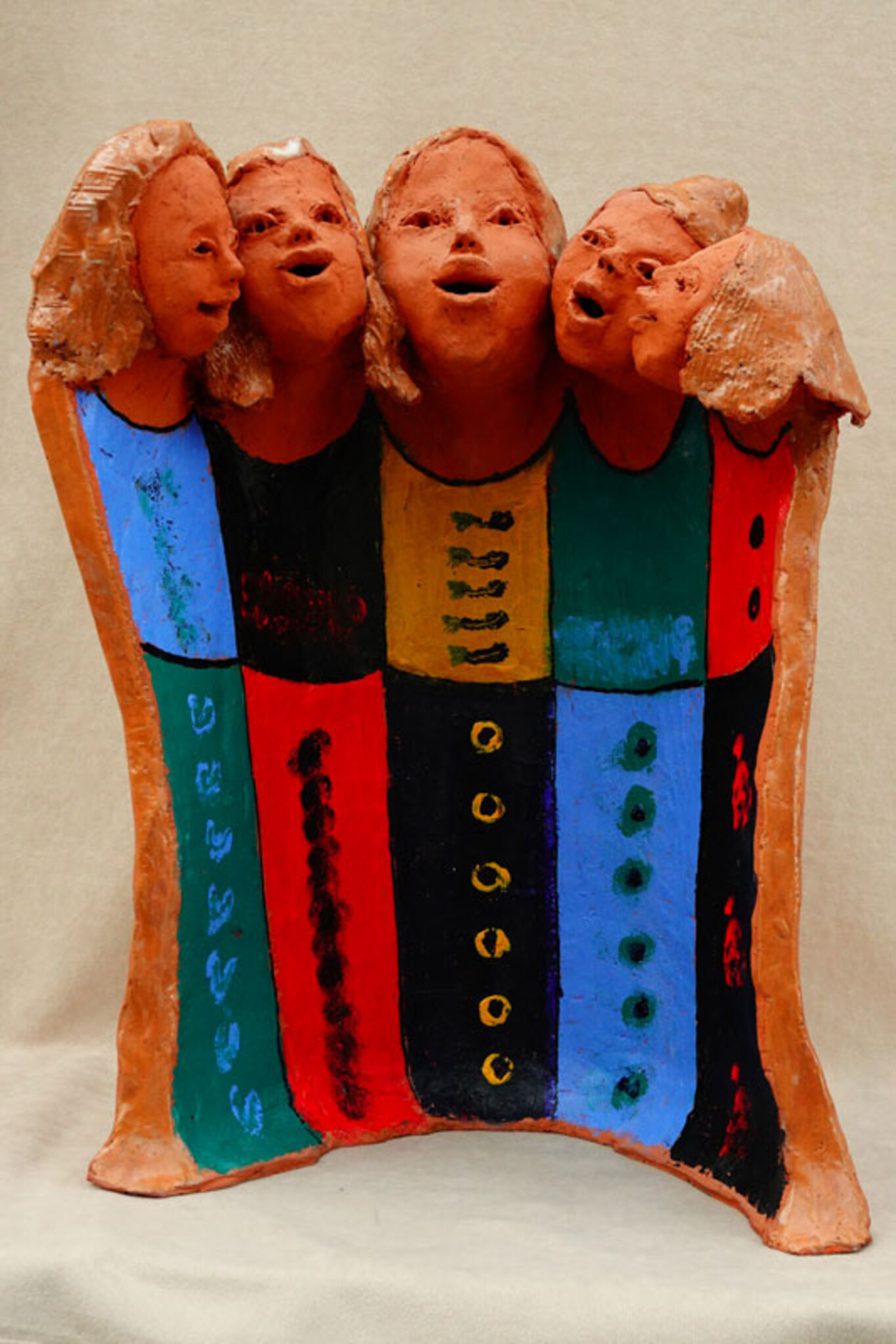 Ik maak koren, omdat ik als koorlid graag zing. Zo heb ik ook in een dameskoor gezongen. Het beeld is met acrylverf beschilderd en gedeeltelijk geglazuurd.
