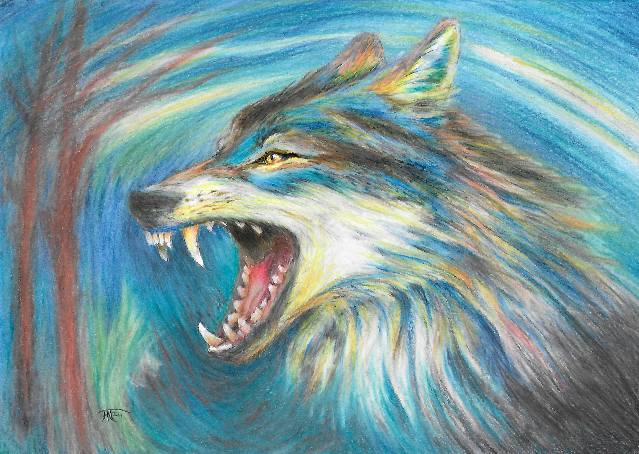 Met veel kleuren is de agressieve wolf in de nacht uitgebeeld. Met pastelkrijt is dit werk gemaakt.