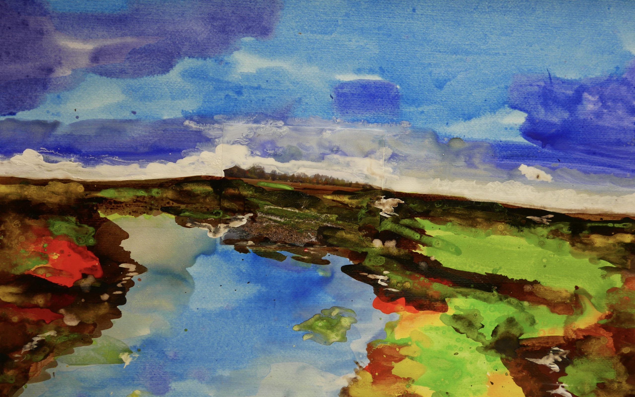 Bruuk moerasland Groesbeek - pigment op papier (acrylbinder) en vernis- een serie van 24 - foto van moerasland in Groesbeek vormt het uitgangspunt - het landschap inspireert tot een nieuw werk waarbij de horizon en het water centraal staan