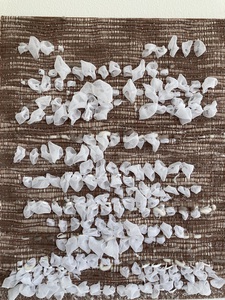 Suze werkt met textiele materialen. Ze werkt in een zeefdruktechniek, en zo maakt ze een abstracte weergave van een thema, gedicht en of intuitief.