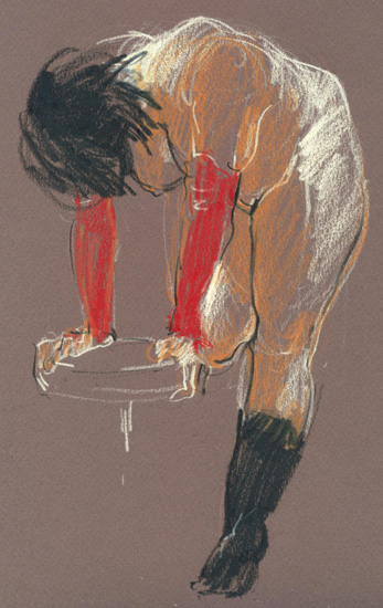 naakt steunend op kruk