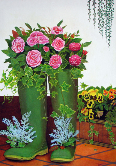 Pioenrozen in rubber laarzen