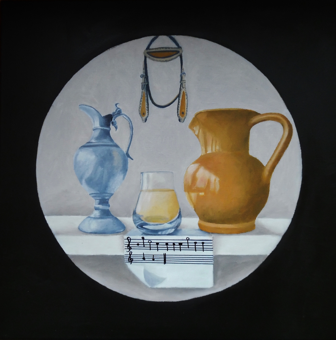 Stilleven van tinnen kan, glas, vaas en breidel