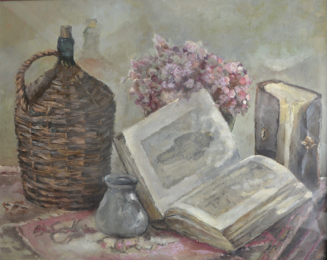 Stilleven met rieten vaas, tinnen kan, bijbel en hortensia