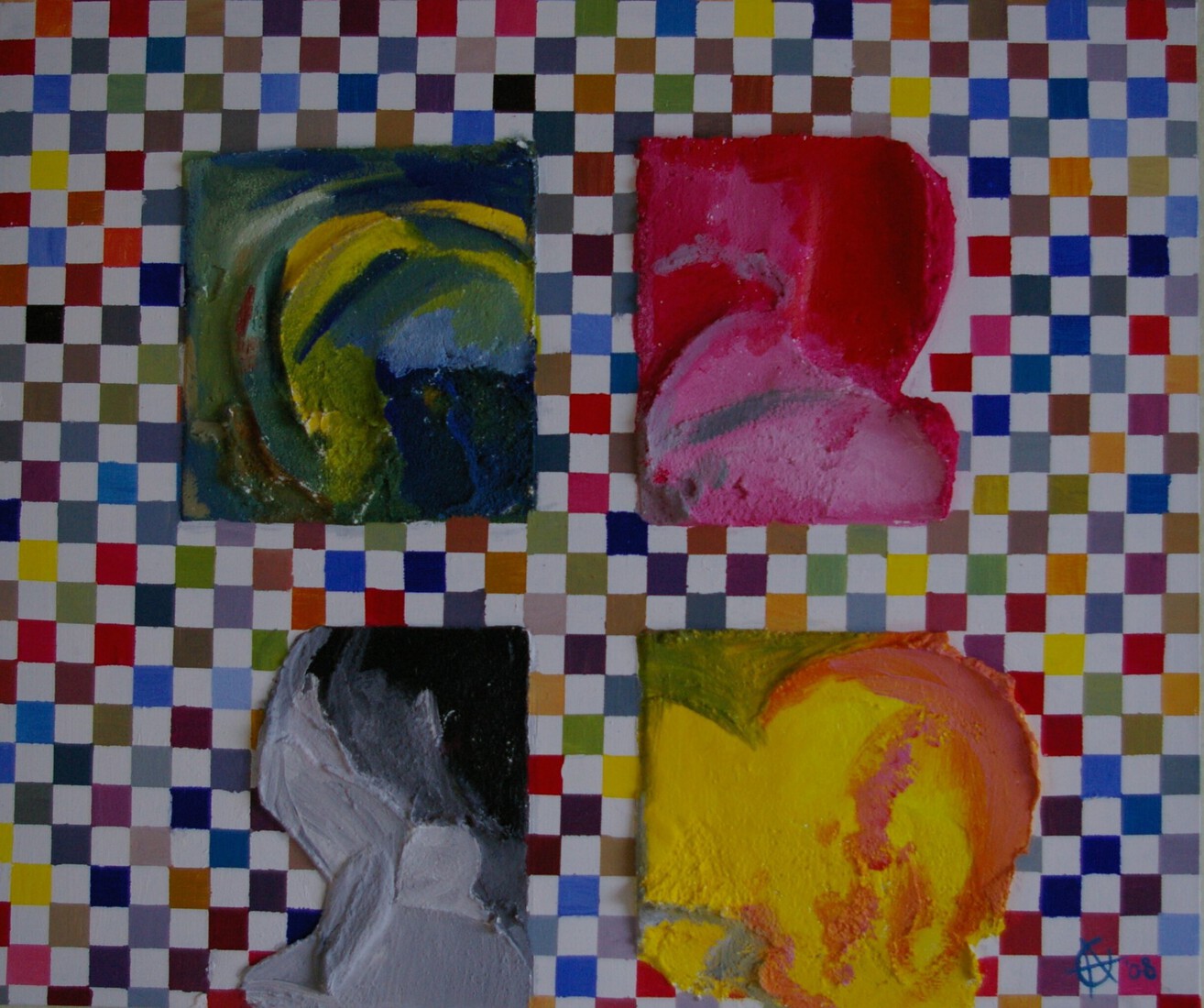 Roze, geel, blauw geblokt