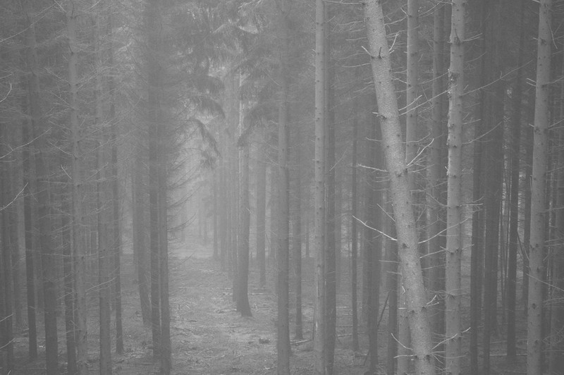 Dennenbos in de mist
