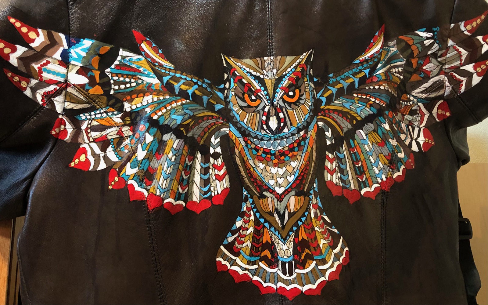 Uil op leren jas — €250,00