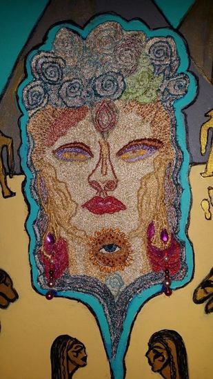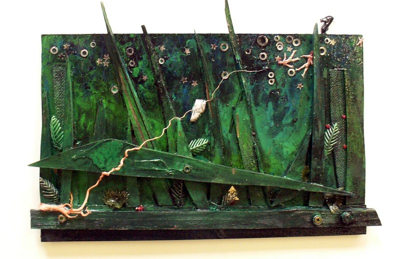 mixed media in spiegelkast in houten lijst