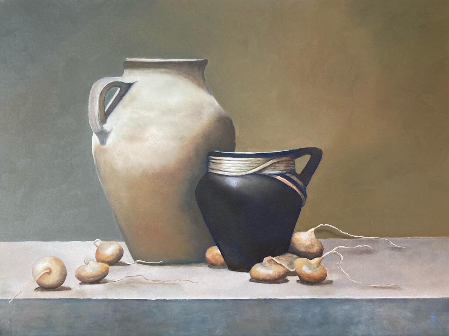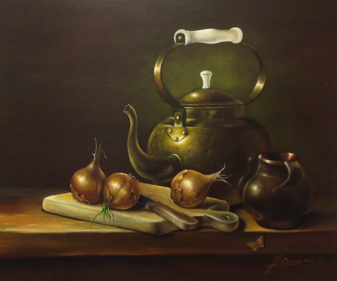 Stilleven met koperenketel men uien