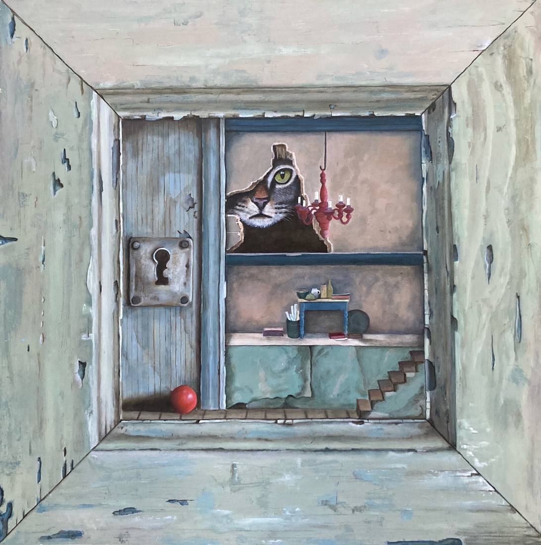 Trompe l’oeil kijkdoos met poes (Verkocht)