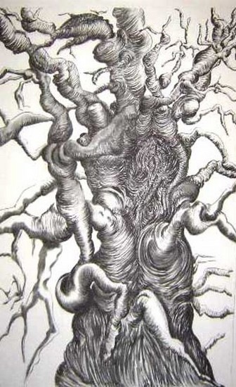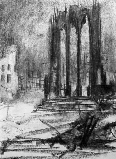 Boom en weide in houtskool.