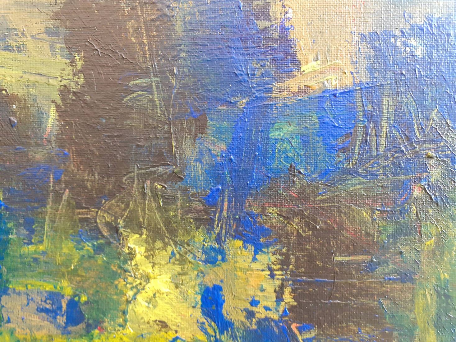 Schilderij met blauw, geel en oranje