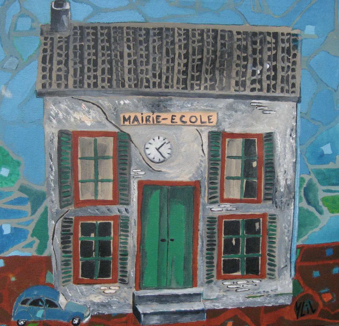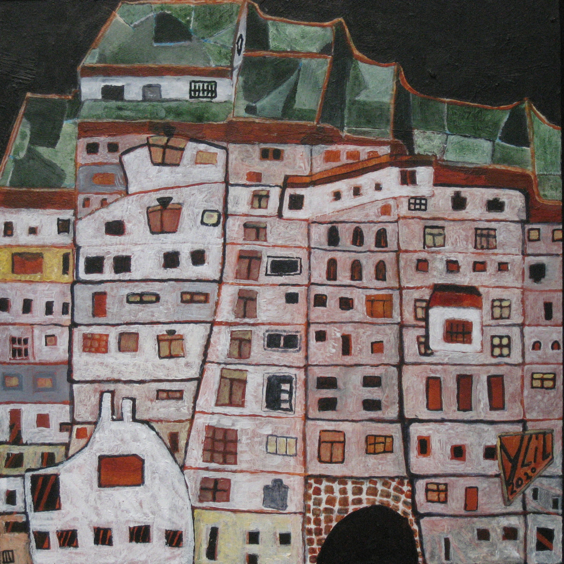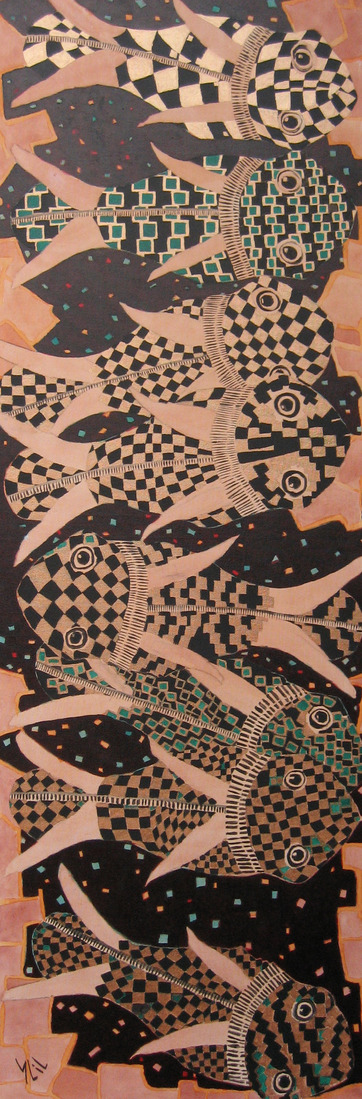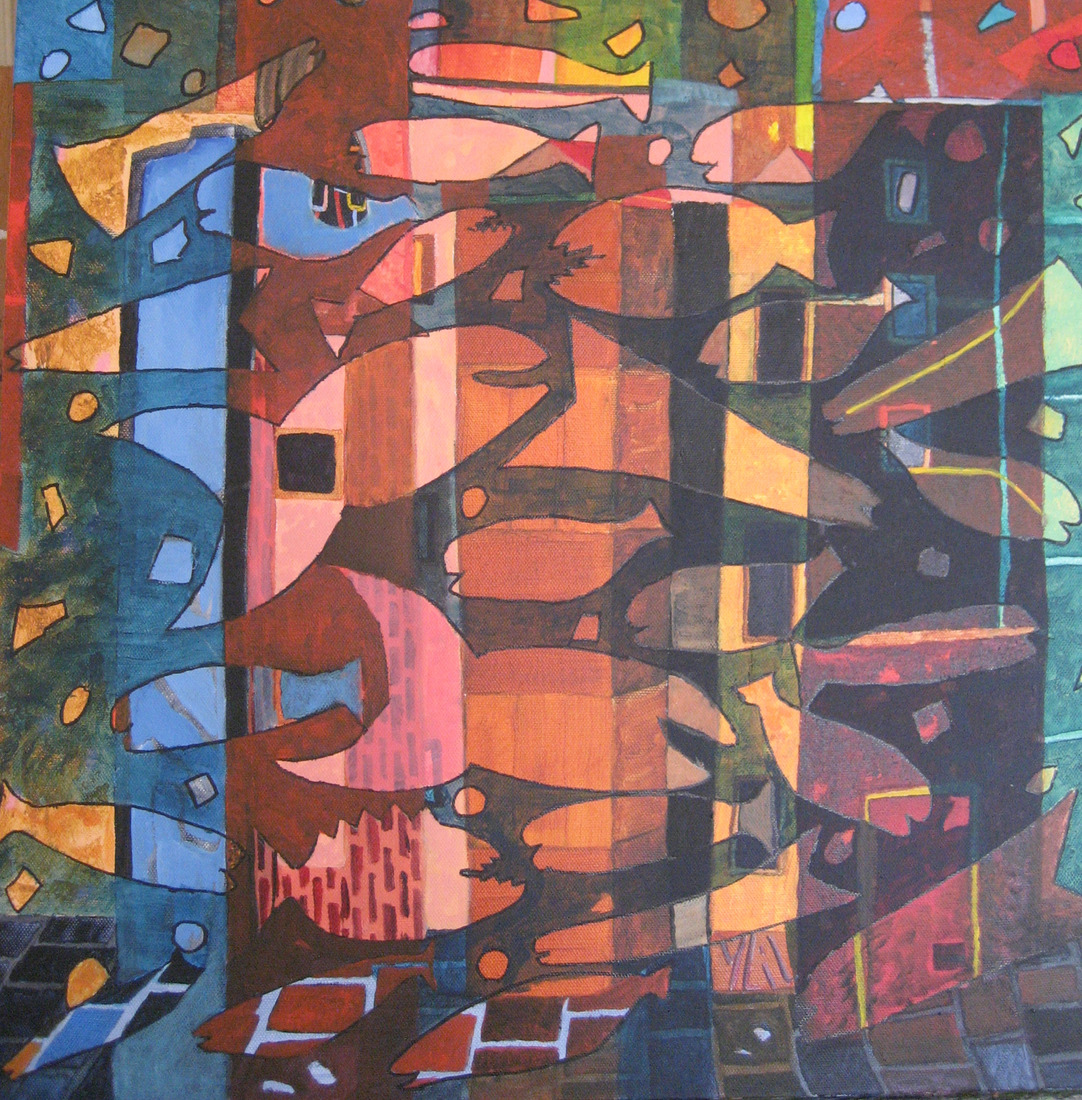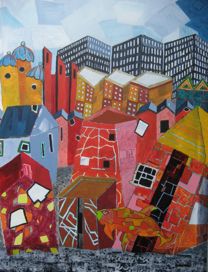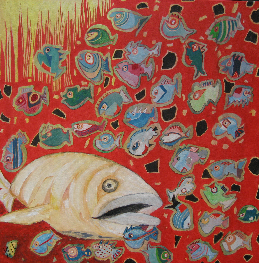 kleurrijke verstilling en beweging in huizen, vissen, bomen en schoenen.