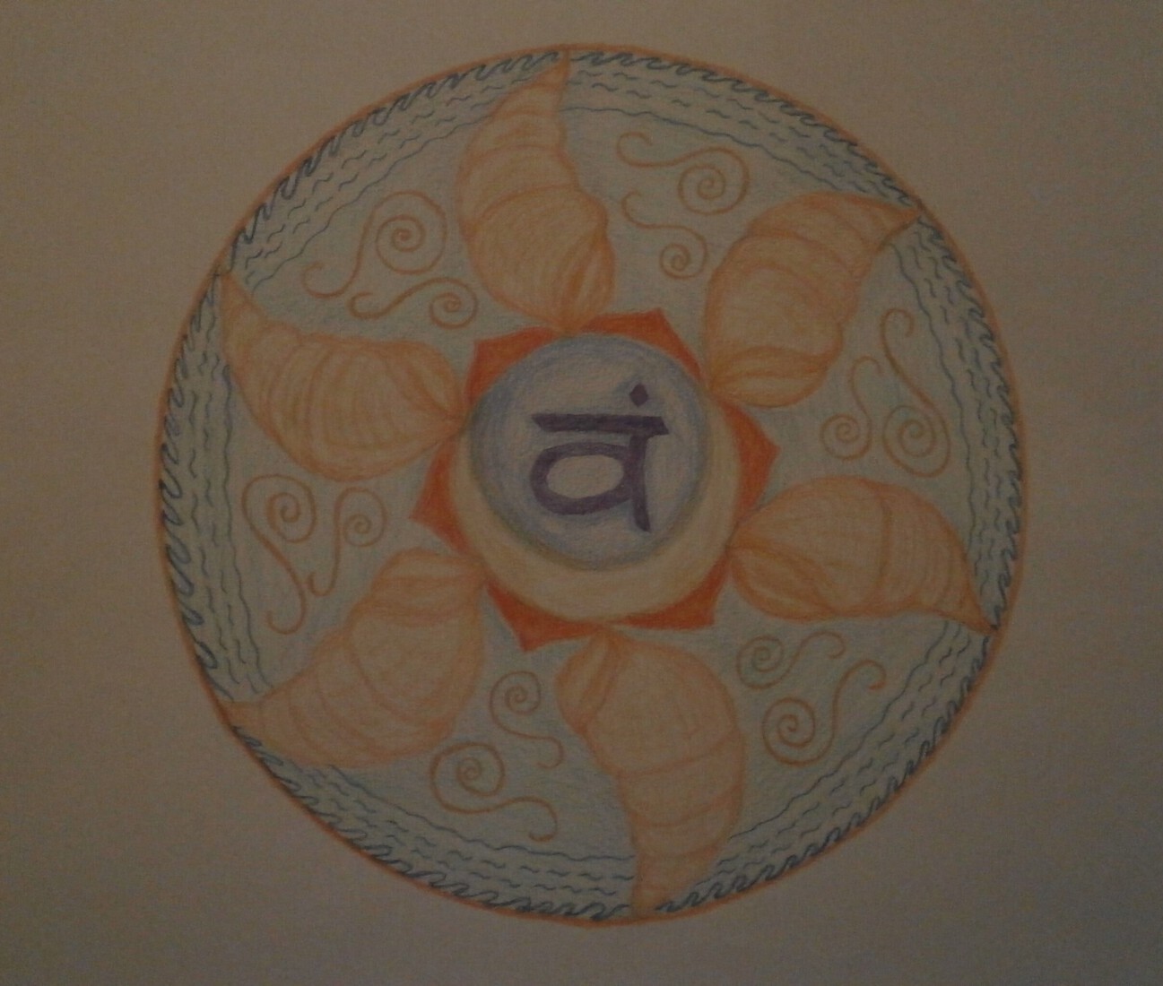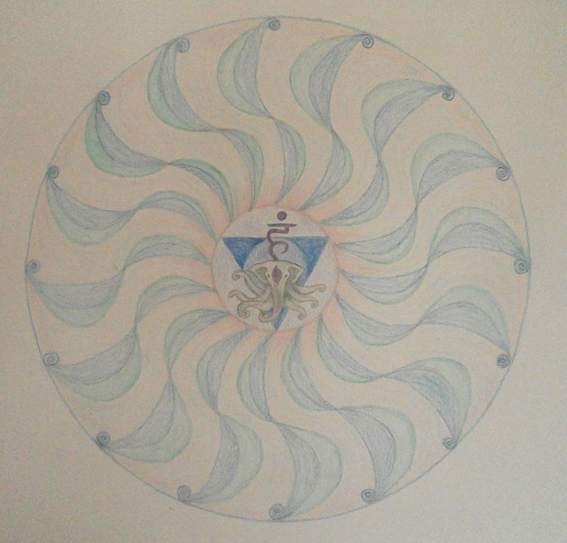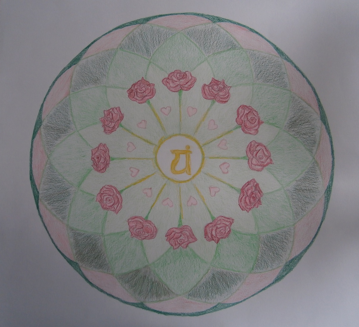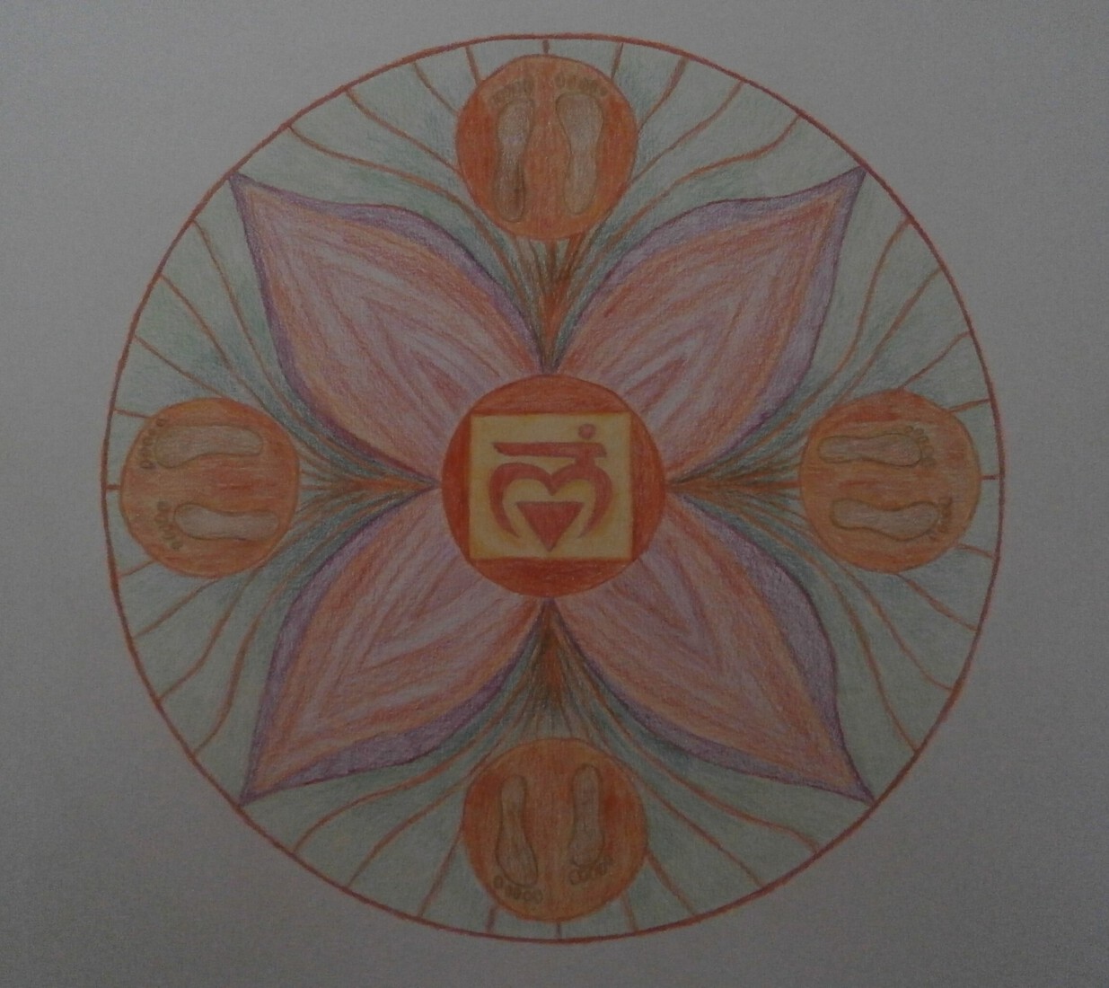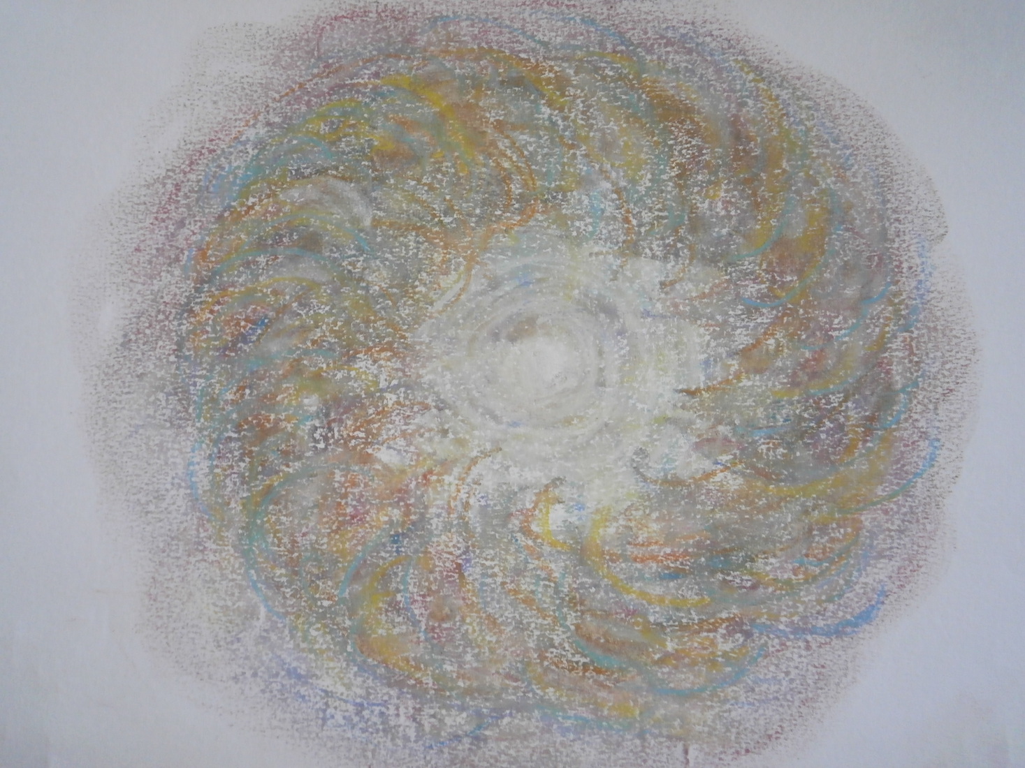de chakra's (energetische krachtpunten) intuïtief weergegeven in pastel en kleurpotlood in mandalavorm