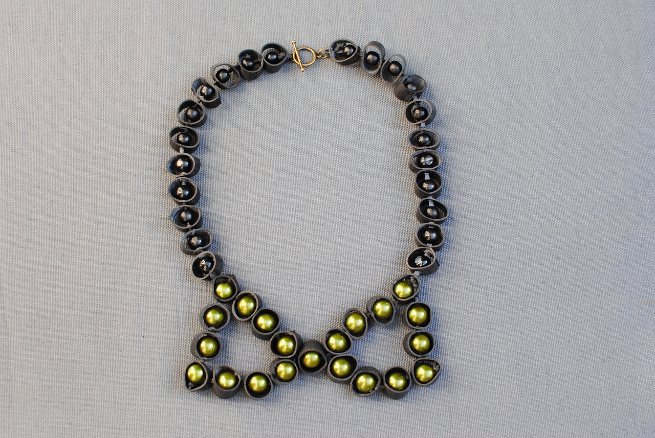 kraag in de vorm van een strik met groene kralen gevat in een rubber-ringetjes