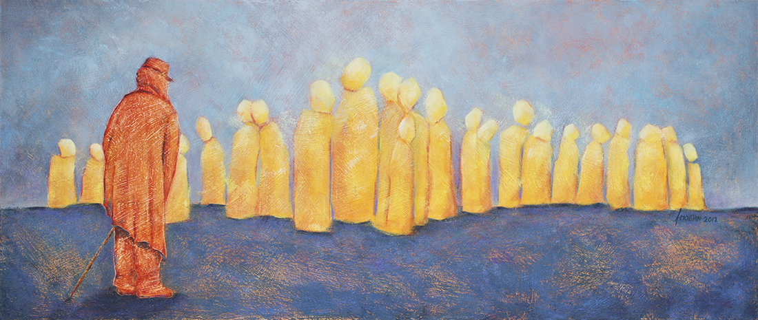 Schilderij Paneel Uitzien Geliefden Hereniging Dood Eeuwig Leven Blauw Oranje Bijbels Christelijk Geloof