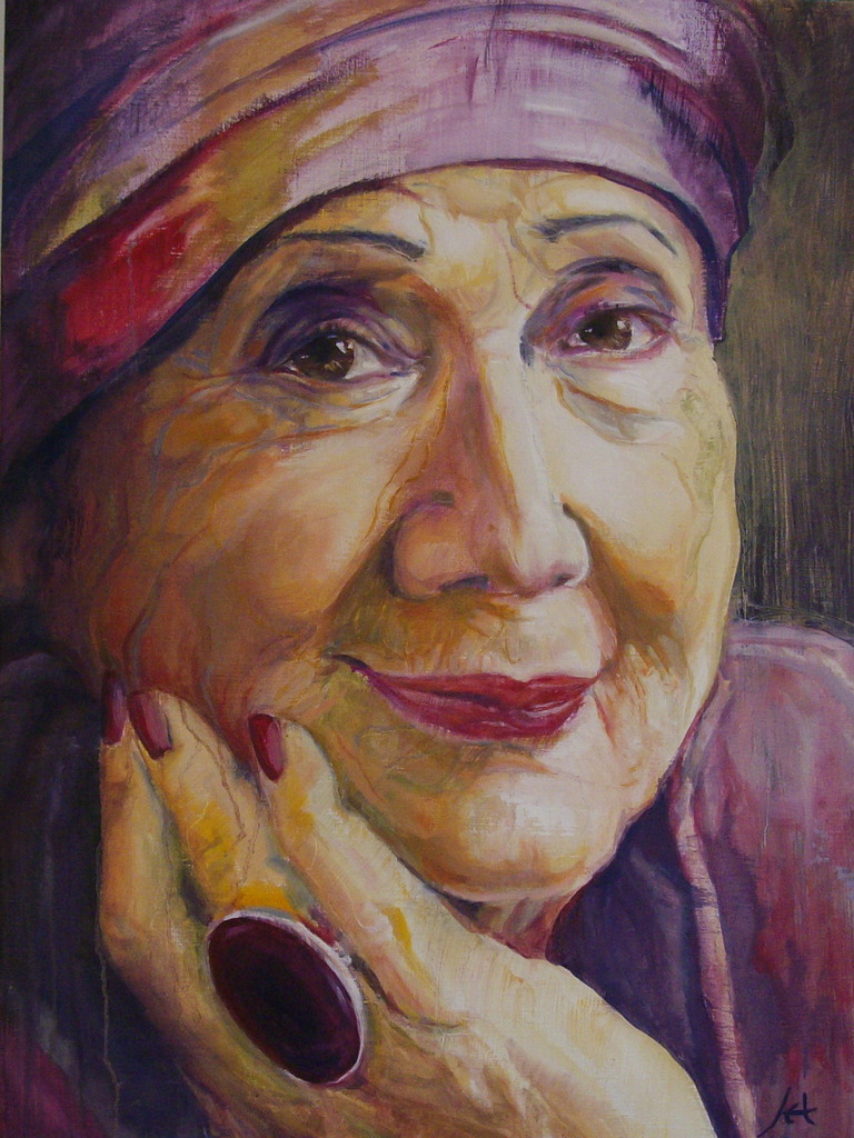 Naar een foto van de kunstenares Lies Lobatto, 90 jaar oud! Ze straalt in mijn ogen wijsheid, levenslust en schoonheid uit; hoezo oud?