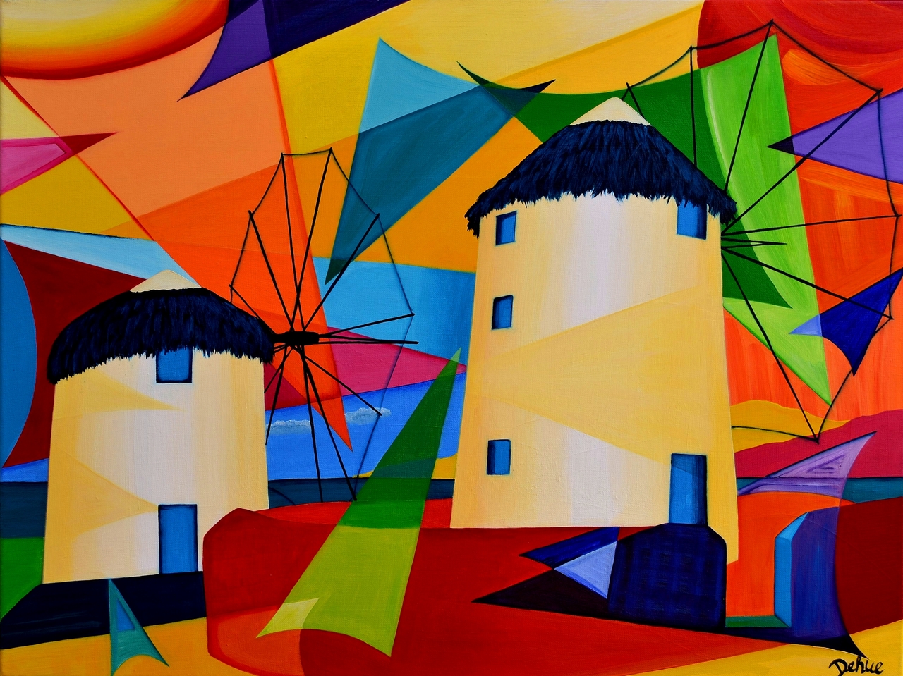 Landschap Kleurrijk Grieks Vrolijk Landscape Fantasie Driehoek Vormen Griekenland Fantasy Greece Colors Colorful Griekse Windmolens Molens Kleurvlakken Fantasielandschap Mills Windmills Driehoeken Mosaic Consensisme Mozaïeklandschap