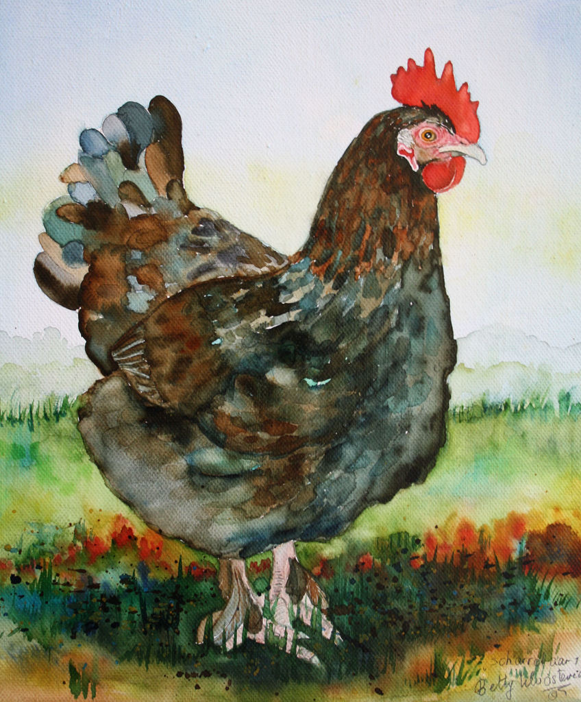 Portret van onze kip, lekker buiten in de tuin. Kan eventueel als tweeluik worden opgehangen samen met scharrelaar 2. Aquarel door een speciale techniek op doek geschilderd.