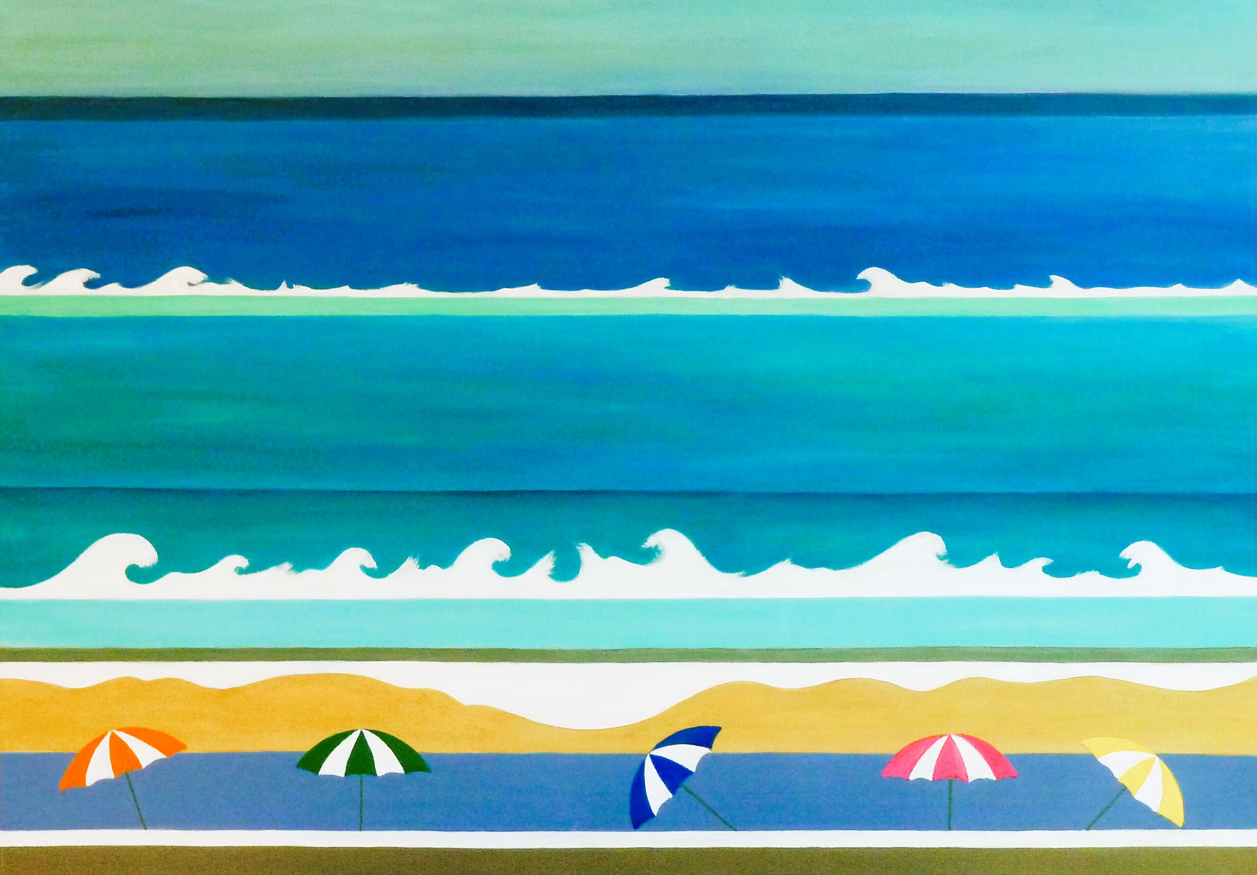 Zomerzon, de zee, het strand. Kleuren en lijnenspel. Van nat zand tot wit strand. Van azuur tot avondblauw, gebroken door spetterende golfslag.