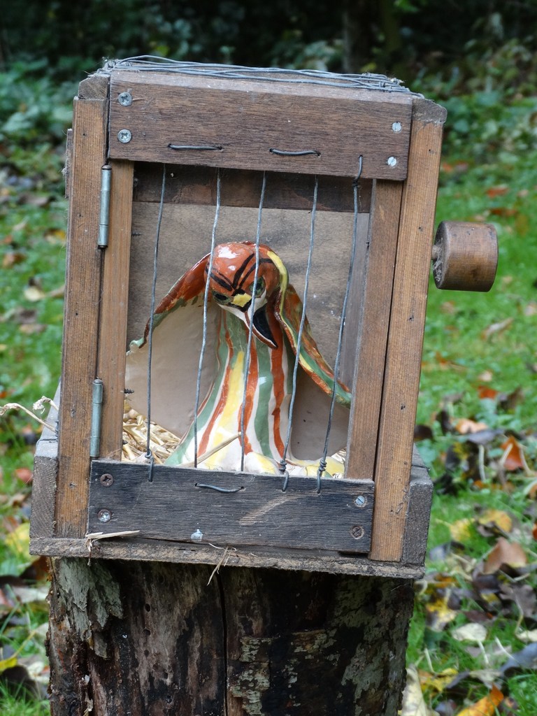 Deze vogel is magisch / behept met een schild / en scherpe snavel. / De eigenaar was behoudend / en stopte haar in een kooi. / Wie de getalsformule / van het slot noemt / maakt haar vrij / en de zijne of hare. Kooi ontworpen door Drager Meurtant. Vogel geschapen (keramiek) door Jeanine Keuchenius (zie ook www.keuchenius.exto.nl). Jaar: 2004