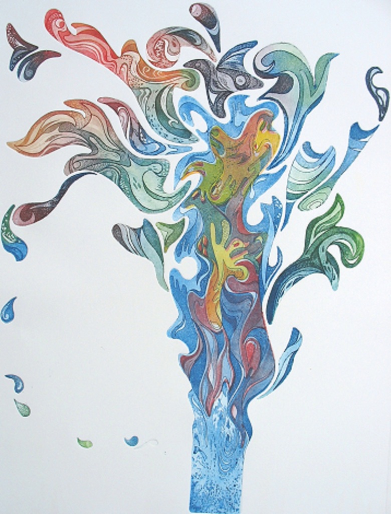Wording III is de derde definitieve versie van een steeds groter wordende ets. Het vertelt iets over mijn eigen groeiproces in het etsen: van een eenvoudige suikeraquatint in de stam, naar een meerkleuriger middenstuk (de rode plaat komt erbij) tot een kleurenpalet in de top, als ook de gele plaat eronder wordt afgedrukt. Daarna werd het steeds uitbundiger, kleuriger, met wilde uitwaaierende vormen, om tenslotte als een soort kringloop weer terug te "druppelen" naar het begin. Oplage: 15