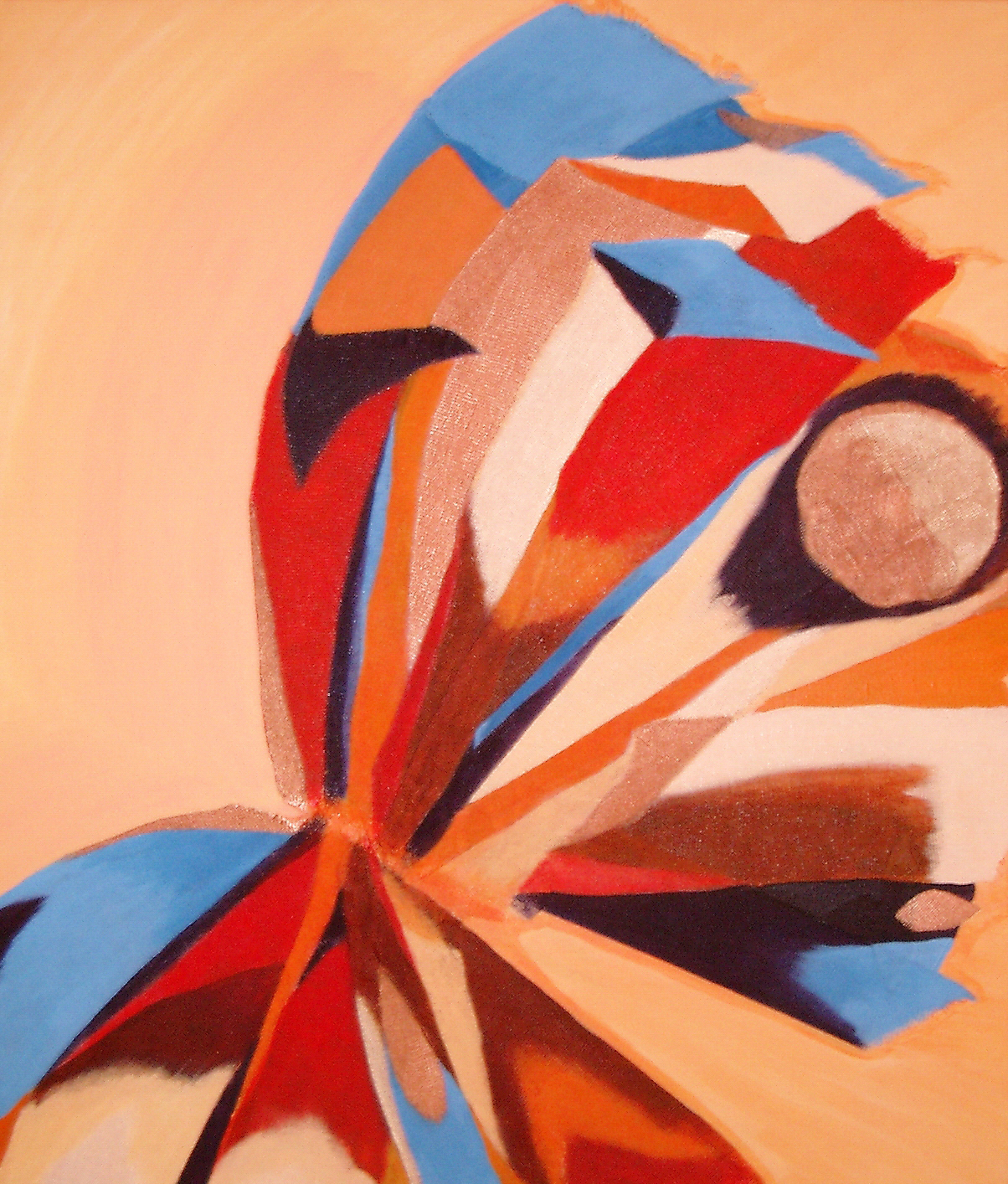 een abstracte vlinder in zachte kleuren waarbij de vleugels gemaakt zijn van gaas en daarme 'op' het doek liggen verkrijgbaar met bijpassende lijst a 30,-