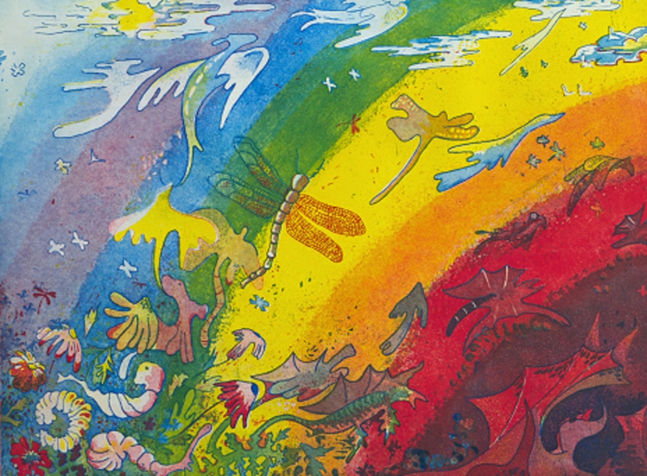 Deze heel kleurige ets, gemaakt met drie platen, bereikt precies wat drie platen moeten bereiken: een scala aan kleuren, vertegenwordigd in de regenboog. Vreemde aardse wompjes, wezentjes, bloempjes, worden omhooggetrokken door de regenboog en transformeren zich. De ene groep gaat naar het licht, worden wolken (of engelen?) en de andere lijken zich te ontwikkelen tot duivels en dalen de rechterhoek in. Oplage: 50
