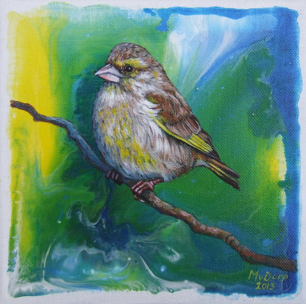 Acryl Schilderijtje Vogeltje Kerst Groenling
