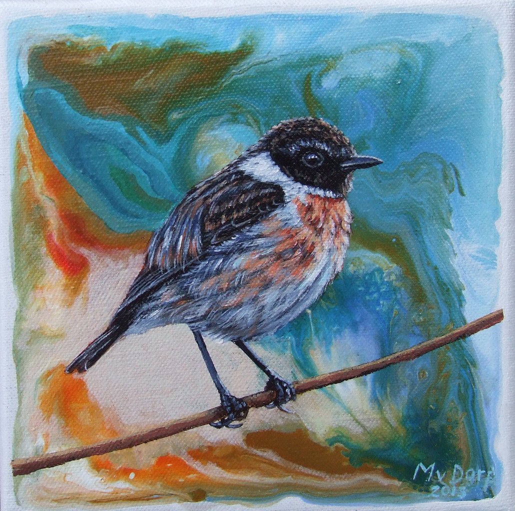 Acrylverf Schilderijtje Vogeltje Roodborsttapuit