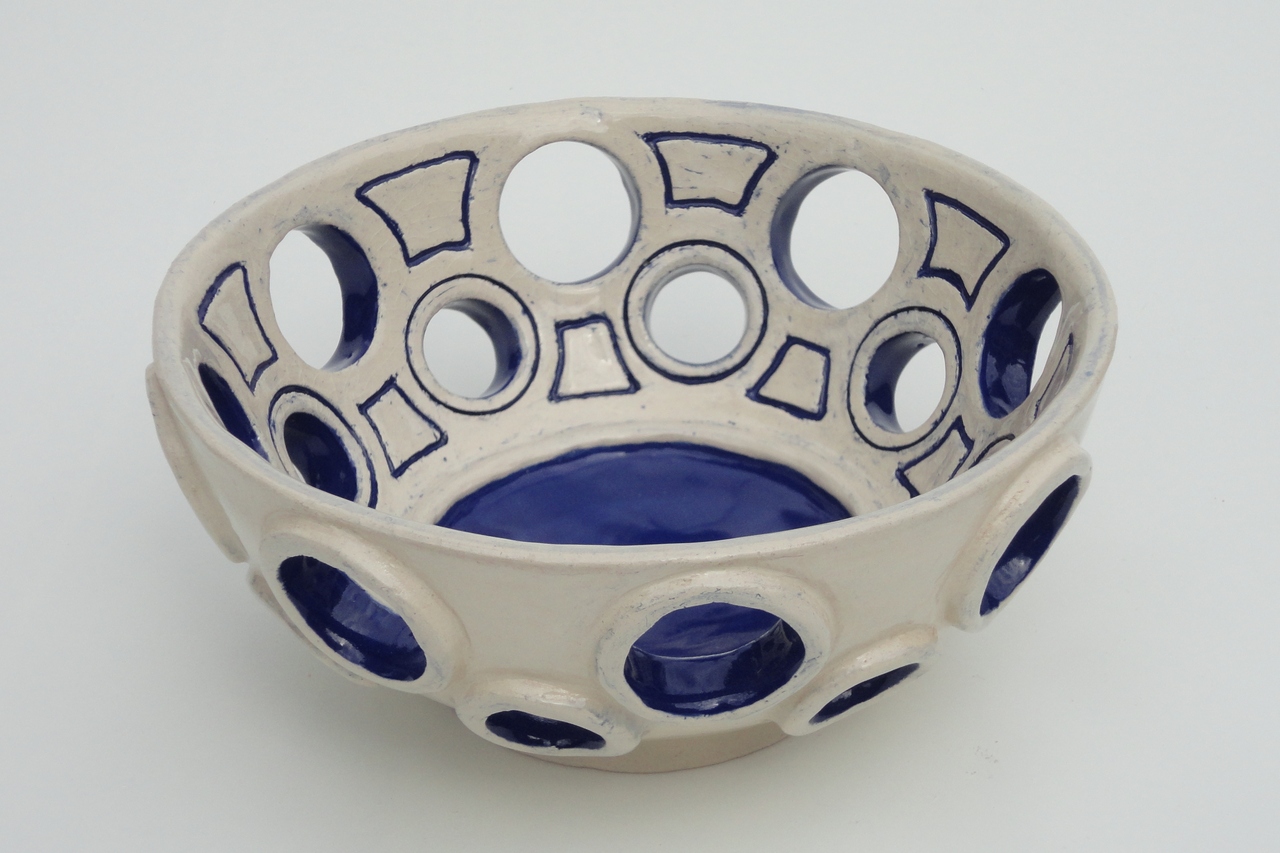 opengewerkte schaal met cirkelvormige patronen kleur delftsblauw/wit