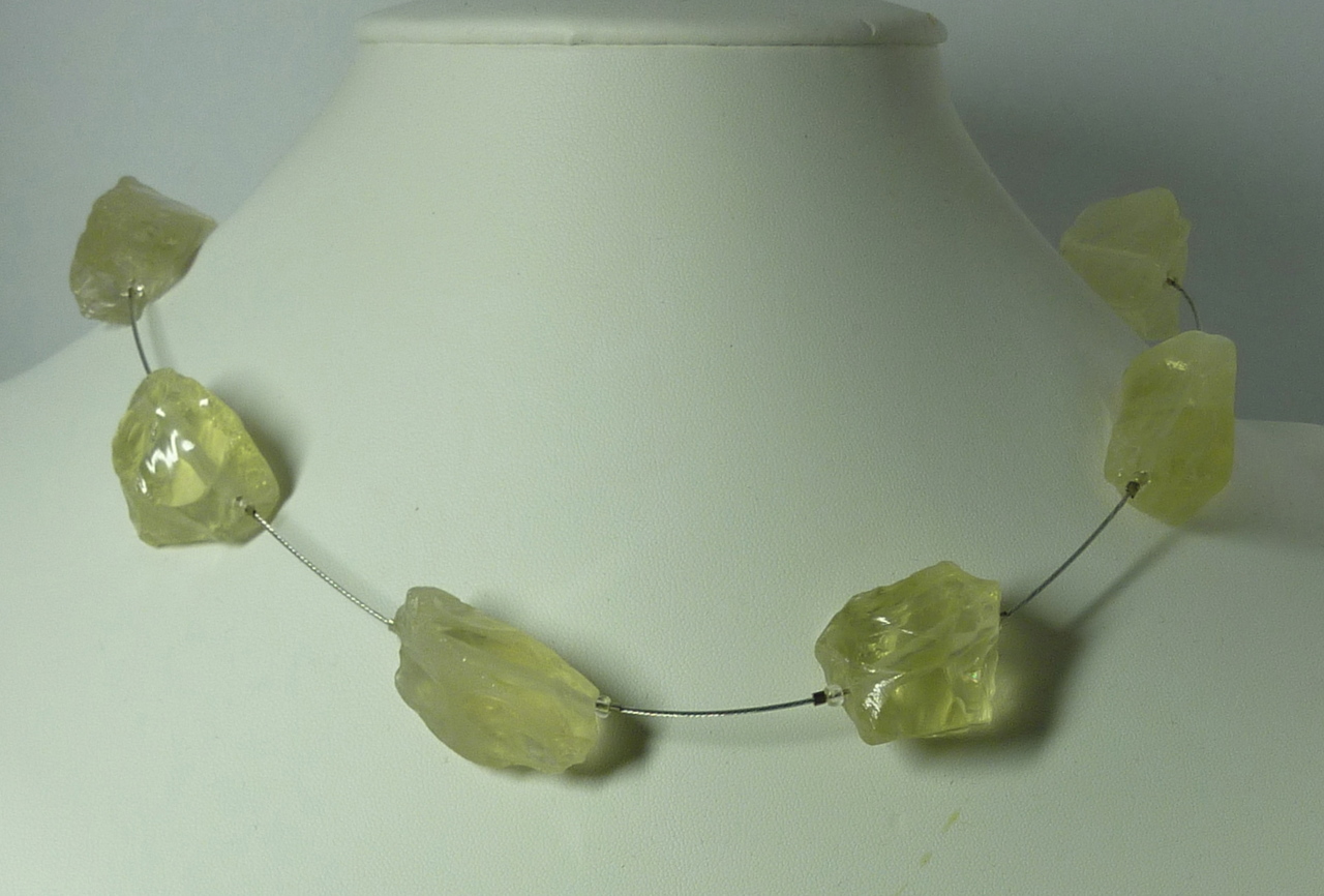 Ketting met 7 kralen/ruwe stukken van citrine (2,5 - 3cm) op gecoat staaldraad. Lengte: 49 cm Incl. organza cadeauzakje en verzendkosten