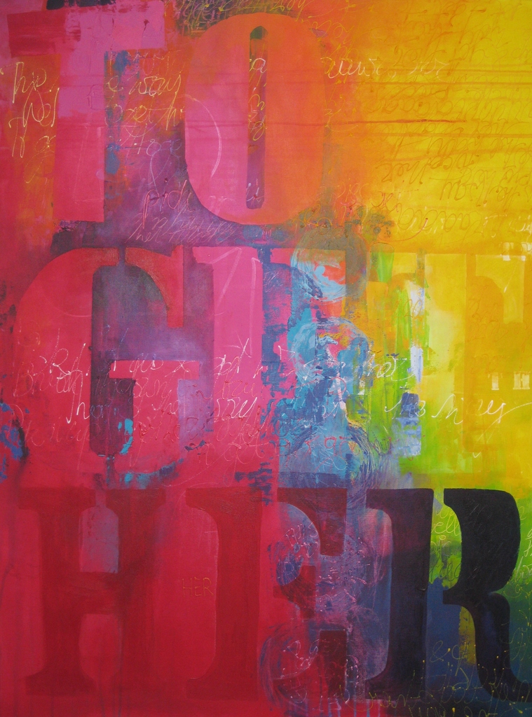 Geïnspireerd op muziek en songteksten van ANOUK. Tijdens het schilderen heb ik de CD Together Alone veel gedraaid en het woord "TOGETHER" op 2 manieren uitgelegd: TOGETHER en TO GET HER. Vandaar dat het ook een twee-luik is geworden.