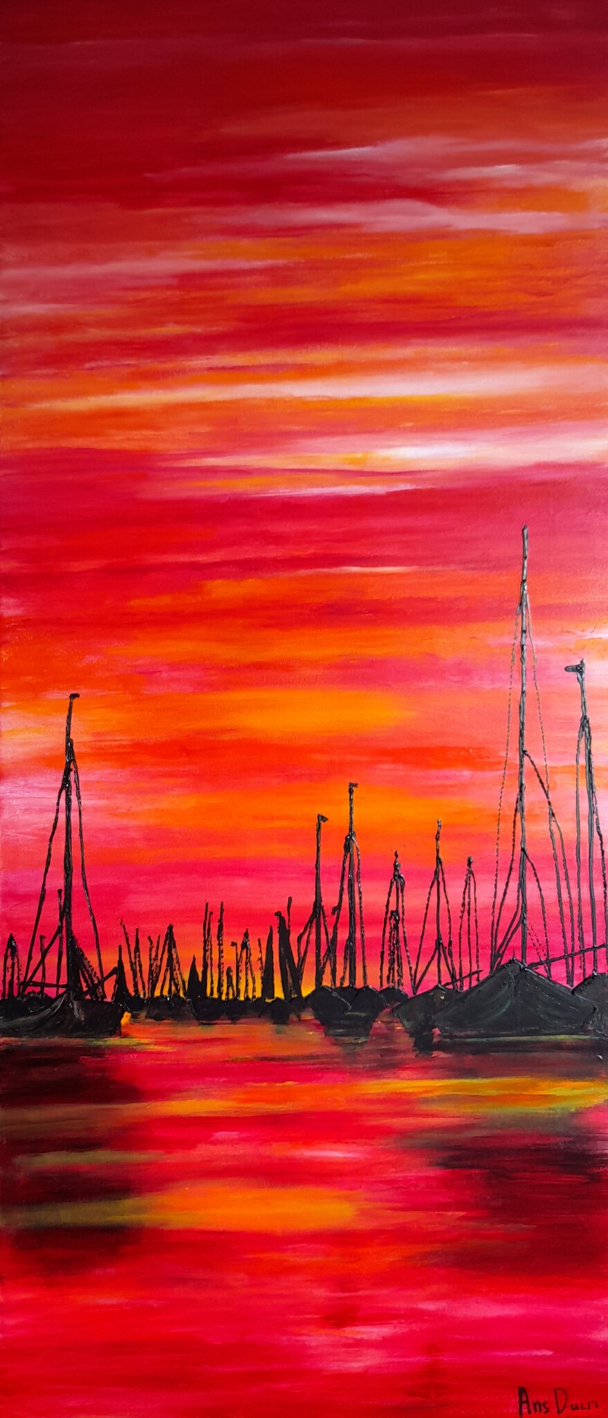 Title: Anchored in the evening .. Acrylic on cotton. Size 140 x 60 x 2 xm. Finished with varnish, for retaining bright color. Free home delivery in the Netherlands.
