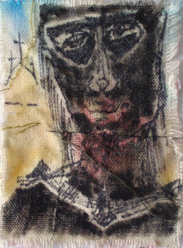 Mini, deel van een serie, geschikt voor in een Tomy Gacha Artomat. Kan opgenaaid worden op tas of jas of als zelfstandig kunstwerk functioneren.