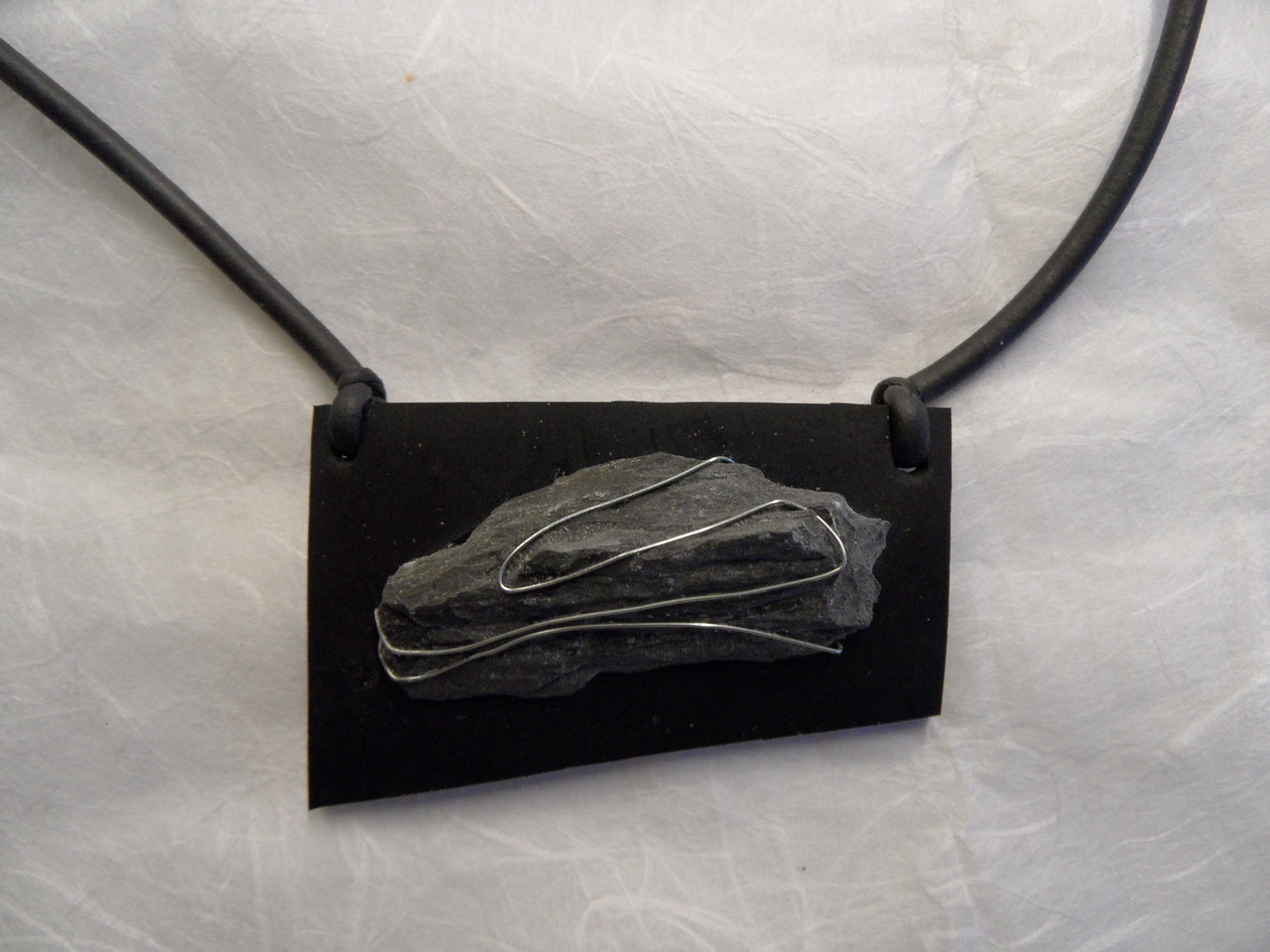 Rubber halssieraad met leisteen en metaldraad.