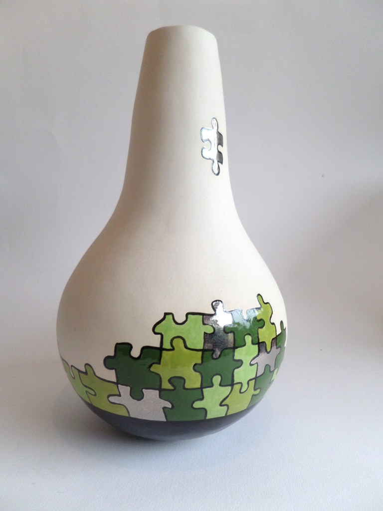 slanke vaas met puzzeldecoratie in engobe en glazuur, zilverluster