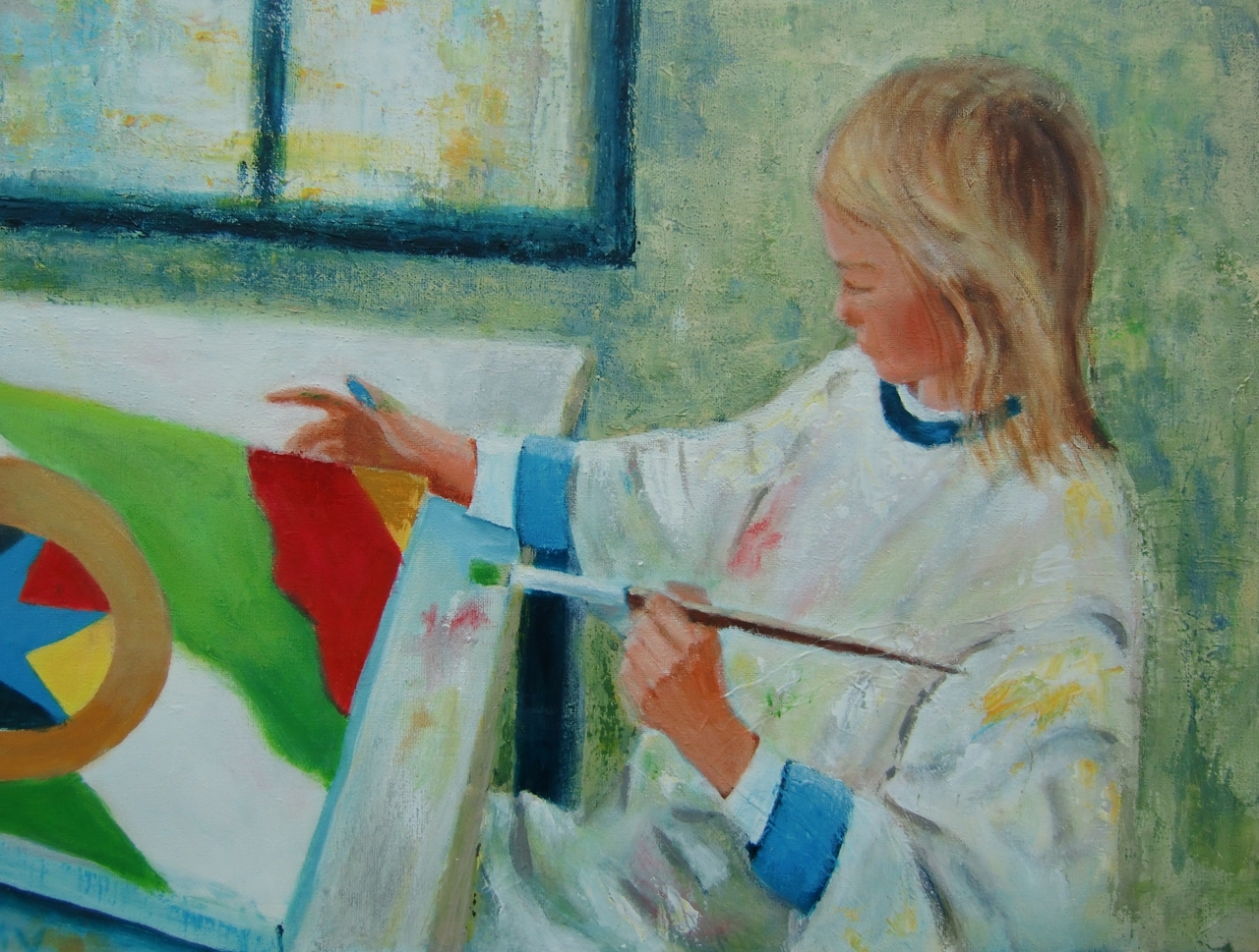 Met een oud T-shirt van opa aan, kan je alleen maar mooier schilderen. Dit tafereel heb ik geschilderd met paletmes.