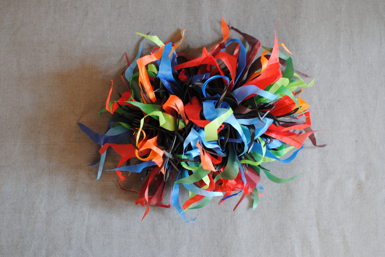 broche in de vorm van een kleurige bloem,gemaakt van rubber en paraplustof