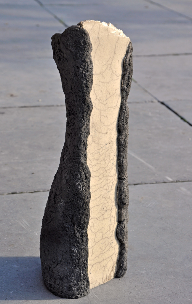 Raku gestookte vaas. Het craquele patroon op de strakke wandplaat is ingeklemd tussen de natuurlijk gevormde bolvaas