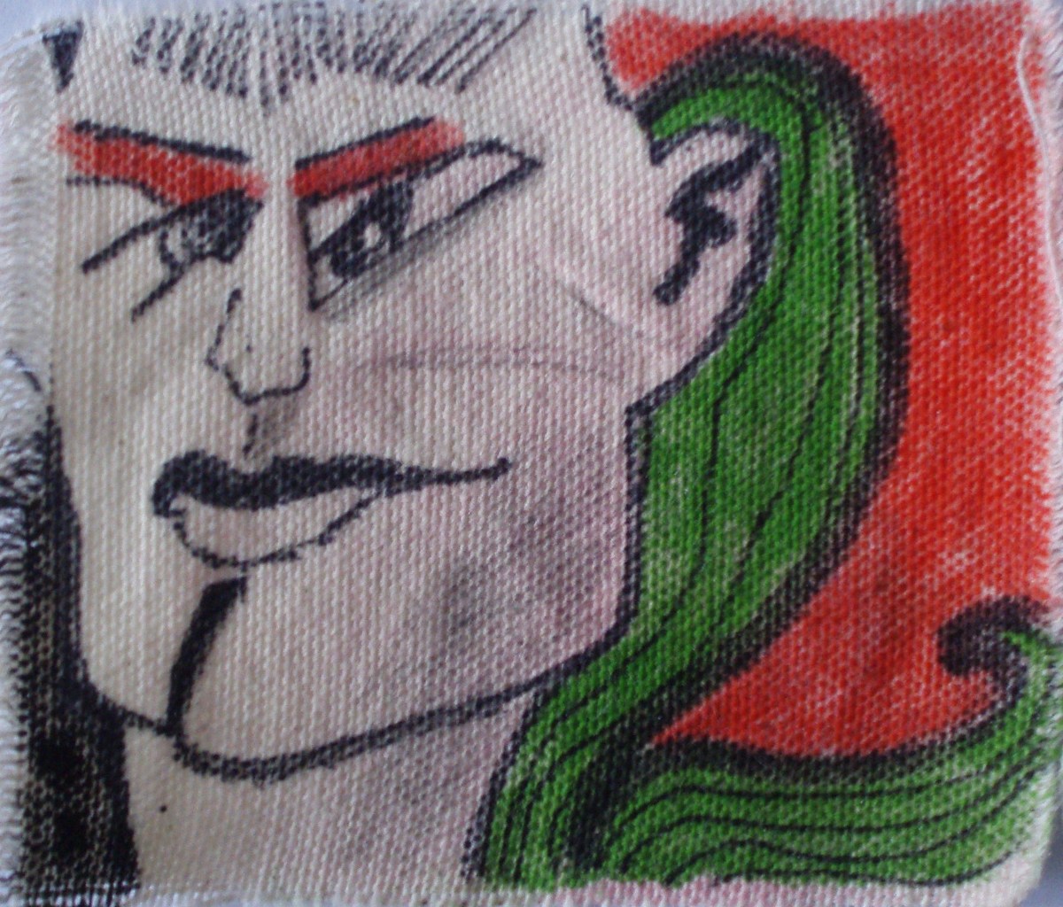 Mini, deel van een serie, geschikt voor in een Tomy Gacha Artomat. Kan opgenaaid worden op tas of jas of als zelfstandig kunstwerk functioneren.