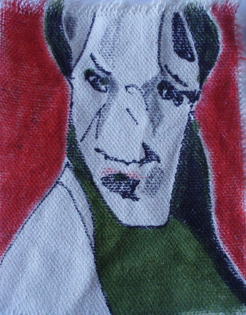 Mini, deel van een serie, geschikt voor in een Tomy Gacha Artomat. Kan opgenaaid worden op tas of jas of als zelfstandig kunstwerk functioneren.