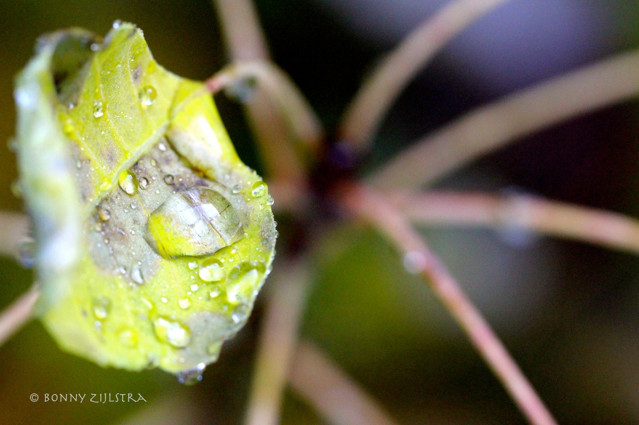 Macro opname van een herfstblad met regendruppels