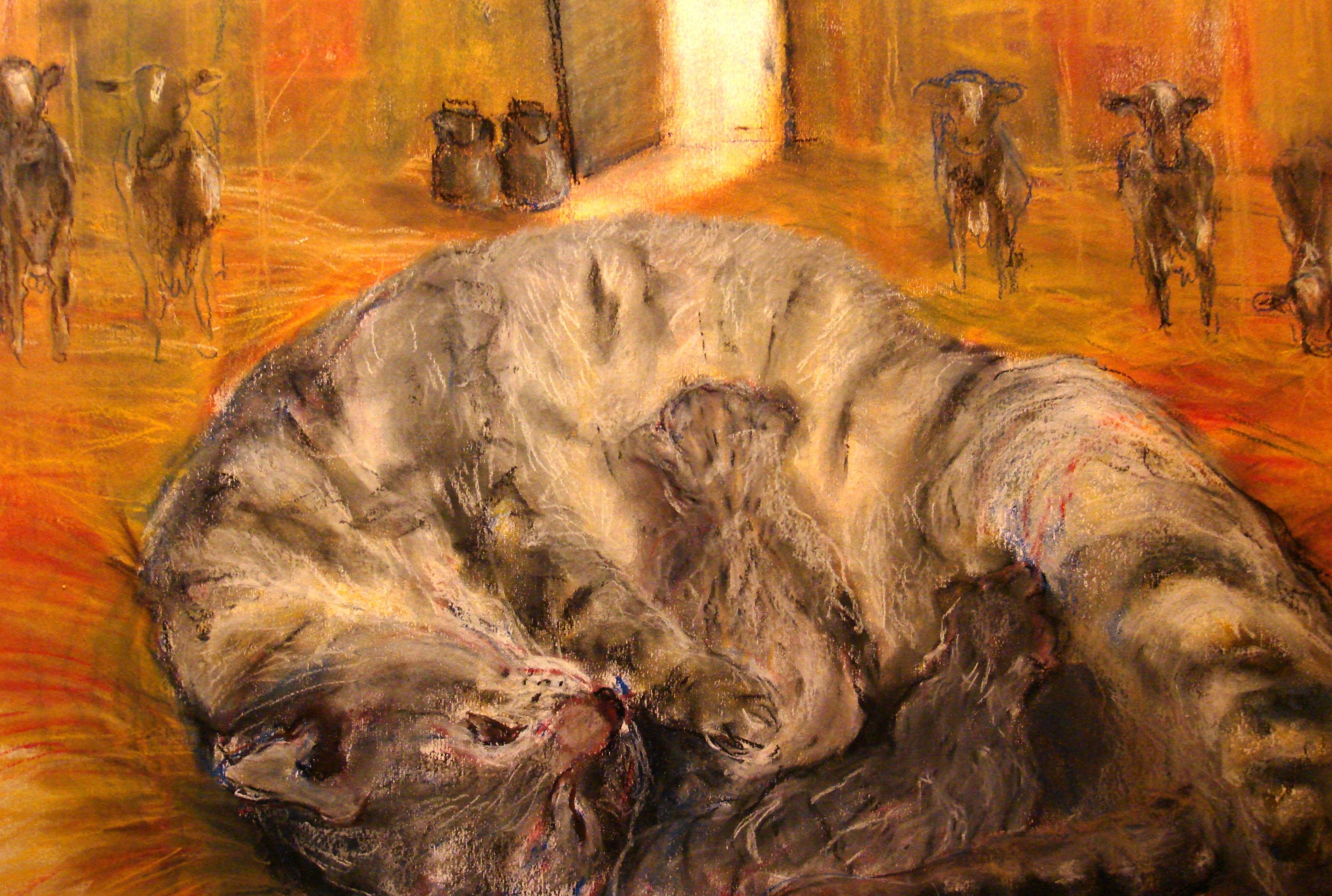 Deze moederpoes heeft een stil en veilig plekje opgezocht in de koeienstal. Hier kan zij op alle begrip rekenen. Wie heeft er anders zoveel verstand van melk geven?