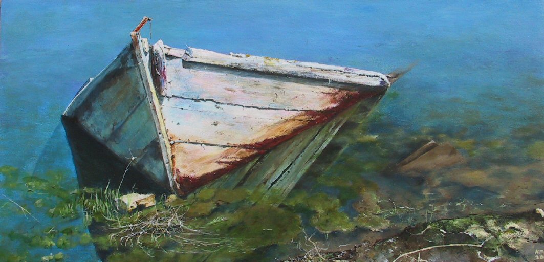 De punt van het bootje stak nog boven het water uit, vlak bij de zoutpannen van Castro Marim, gezonken, niet meer nodig, te veel moeite om te bergen. Inclusief lijst