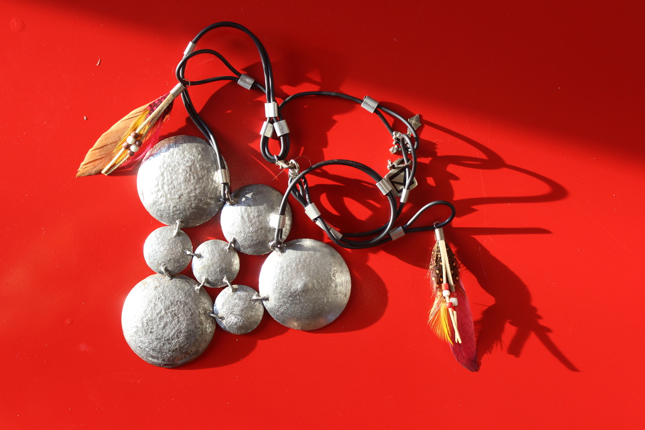 Outer space. Halssierraad bestaand uit rubber, veertjes, metaal.