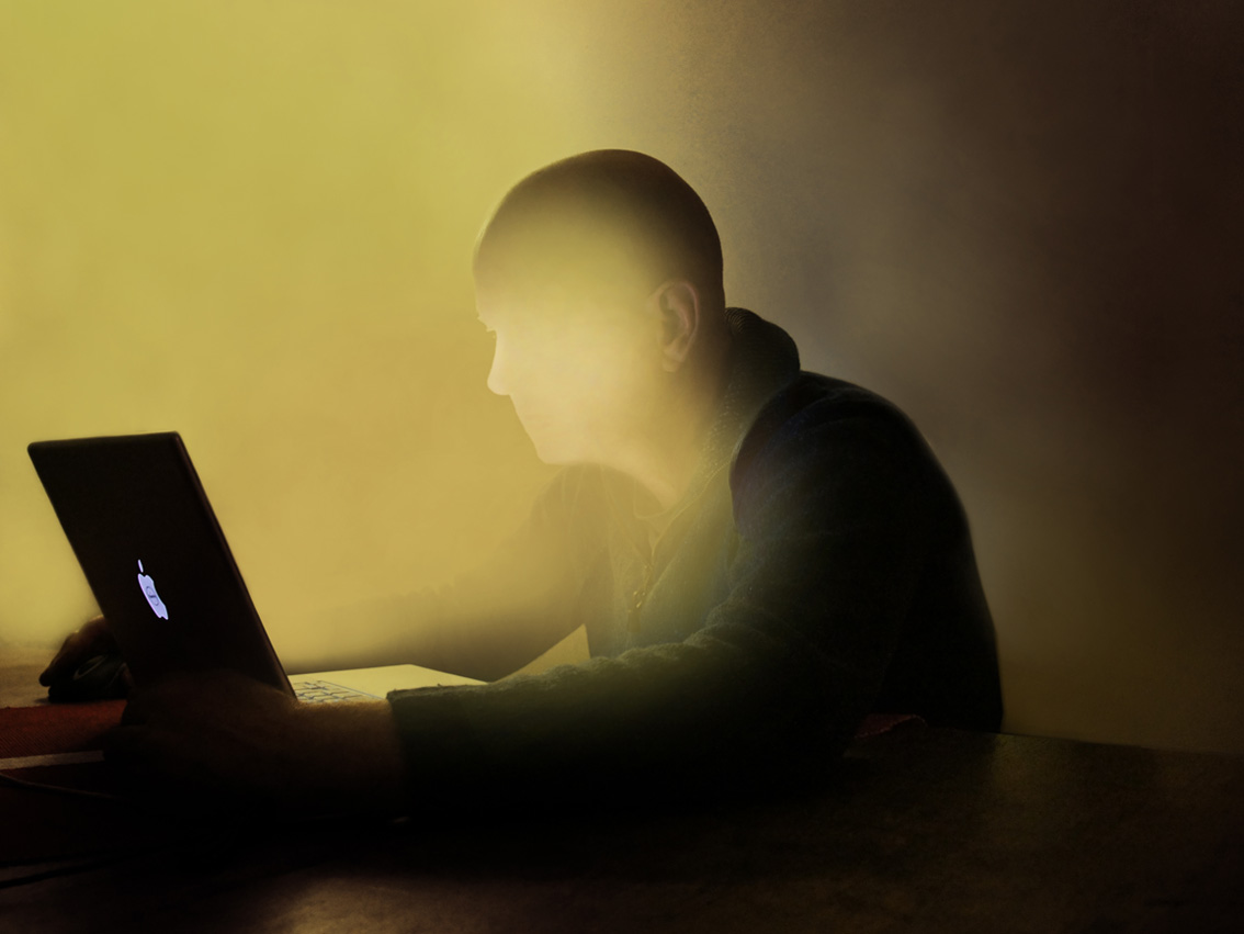 Geel Man Digitaal Licht Mens Kaal Metamorfose Verandering Computer Schijnsel Lichtbron Schijn Pc Evolutie Vooruitgang Robot Transmissie Obsessie Beeldscherm Schijnwereld Tijdsgeest Straling Gedigitaliseerd Progressie